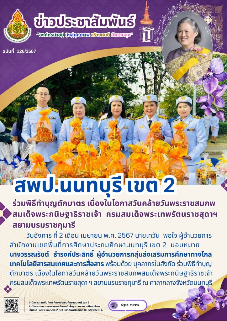 วันอังคาร ที่ 2 เดือน เมษายน พ.ศ. 2567 นายเทวัน พอใจ ผู้อำนวยการสำนักงานเขตพื้นที่การศึกษาประถมศึกษานนทบุรี เขต 2 มอบหมาย นางวรรณรัชต์ ธำรงค์ประสิทธิ์ ผู้อำนวยการกลุ่มส่งเสริมการศึกษาทางไกลเทคโนโลยีสารสนเทศและการสื่อสาร พร้อมด้วย บุคลากรในสังกัด ร่วมพิธีทำบุญตักบาตร เนื่องในโอกาสวันคล้ายวันพระราชสมภพสมเด็จพระกนิษฐาธิราชเจ้า กรมสมเด็จพระเทพรัตนราชสุดา ฯ สยามบรมราชกุมารี ณ ศาลากลางจังหวัดนนทบุรี