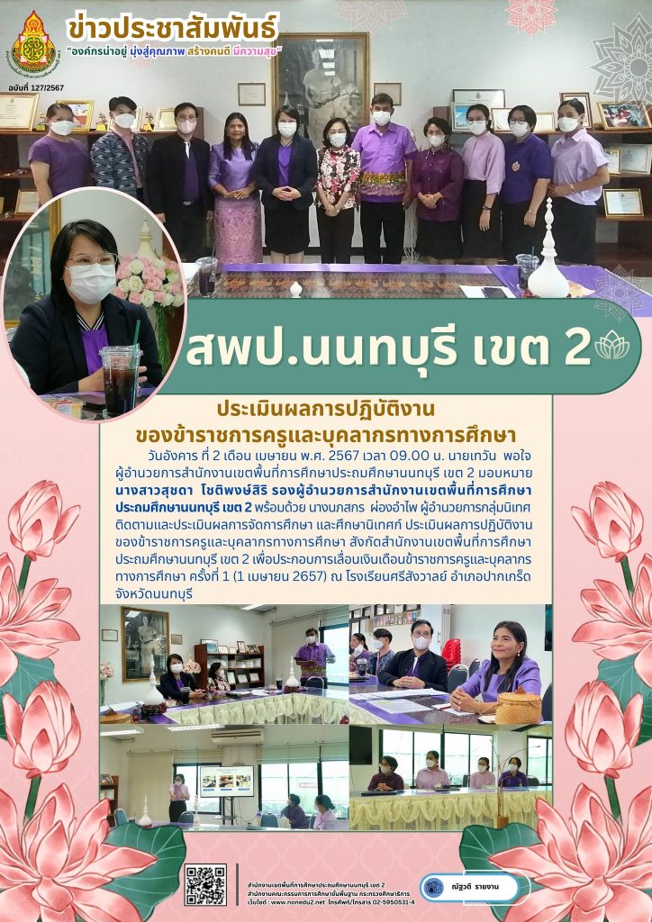 วันอังคาร ที่ 2 เดือน เมษายน พ.ศ. 2567 เวลา 09.00 น. นายเทวัน พอใจ ผู้อำนวยการสำนักงานเขตพื้นที่การศึกษาประถมศึกษานนทบุรี เขต 2 มอบหมาย นางสาวสุชดา โชติพงษ์สิริ รองผู้อำนวยการสำนักงานเขตพื้นที่การศึกษาประถมศึกษานนทบุรี เขต 2 พร้อมด้วย นางนภสกร ผ่องอำไพ ผู้อำนวยการกลุ่มนิเทศ ติดตามและประเมินผลการจัดการศึกษา และศึกษานิเทศก์ ประเมินผลการปฏิบัติงานของข้าราชการครูและบุคลากรทางการศึกษา สังกัดสำนักงานเขตพื้นที่การศึกษาประถมศึกษานนทบุรี เขต 2 เพื่อประกอบการเลื่อนเงินเดือนข้าราชการครูและบุคลากรทางการศึกษาครั้งที่ 1 (1 เมษายน 2657) ณ โรงเรียนศรีสังวาลย์ อำเภอปากเกร็ด จังหวัดนนทบุรี