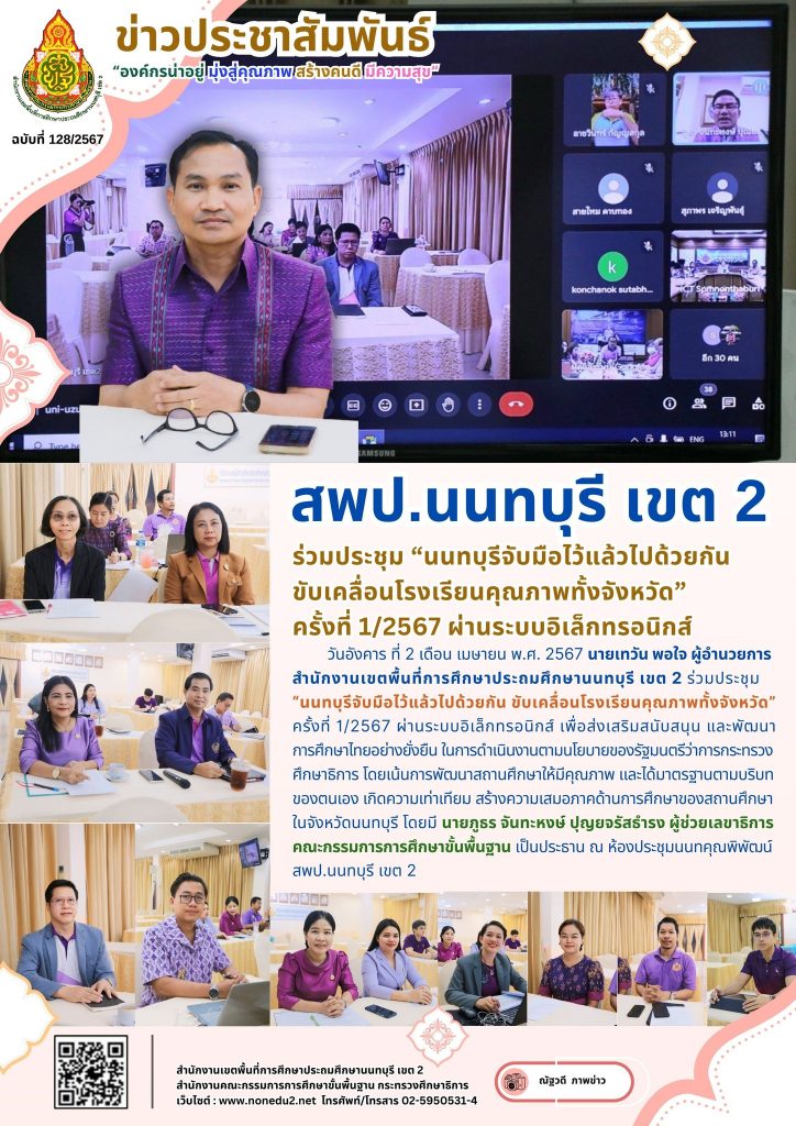 วันอังคาร ที่ 2 เดือน เมษายน พ.ศ. 2567 นายเทวัน พอใจ ผู้อำนวยการสำนักงานเขตพื้นที่การศึกษาประถมศึกษานนทบุรี เขต 2 ร่วมประชุม “นนทบุรีจับมือไว้แล้วไปด้วยกัน ขับเคลื่อนโรงเรียนคุณภาพทั้งจังหวัด” ครั้งที่ 1/2567 ผ่านระบบอิเล็กทรอนิกส์ เพื่อส่งเสริมสนับสนุน และพัฒนาการศึกษาไทยอย่างยั่งยืน ในการดำเนินงานตามนโยบายของรัฐมนตรีว่าการกระทรวงศึกษาธิการ โดยเน้นการพัฒนาสถานศึกษาให้มีคุณภาพ และได้มาตรฐานตามบริบทของตนเอง เกิดความเท่าเทียม สร้างความเสมอภาคด้านการศึกษาของสถานศึกษาในจังหวัดนนทบุรี โดยมี นายภูธร จันทะหงษ์ ปุญยจรัสธำรง ผู้ช่วยเลขาธิการคณะกรรมการการศึกษาขั้นพื้นฐาน เป็นประธาน ณ ห้องประชุมนนทคุณพิพัฒน์ สพป.นนทบุรี เขต 2