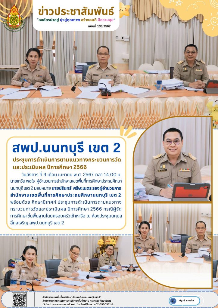 วันอังคาร ที่ 9 เดือน เมษายน พ.ศ. 2567 เวลา 14.00 น. นายเทวัน พอใจ ผู้อำนวยการสำนักงานเขตพื้นที่การศึกษาประถมศึกษานนทบุรี เขต 2 มอบหมาย นายปรินทร์ ศรีษะเนตร รองผู้อำนวยการสำนักงานเขตพื้นที่การศึกษาประถมศึกษานนทบุรี เขต 2 พร้อมด้วย ศึกษานิเทศก์ ประชุมการดำเนินการตามแนวทางกระบวนการวัดและประเมินผล ปีการศึกษา 2566 กรณีผู้จัดการศึกษาขั้นพื้นฐานโดยครอบครัวเข้าหารือ ณ ห้องประชุมนฤมล ลี้กุลเจริญ สพป.นนทบุรี เขต 2