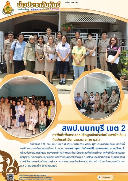 วันอังคาร ที่ 9 เดือน เมษายน พ.ศ. 2567 นายเทวัน พอใจ ผู้อำนวยการสำนักงานเขตพื้นที่การศึกษาประถมศึกษานนทบุรี เขต 2 มอบหมาย นางสาวสุชดา โชติพงษ์สิริ รอง ผอ.สพป.นนทบุรี เขต 2 พร้อมด้วย นางสาวธัญพร ทองงาม นักจิตวิทยาประจำสำนักงานเขตพื้นที่การศึกษา ลงพื้นที่เพื่อตรวจสอบข้อมูลเชิงประจักษ์ ของนักเรียนที่สมัครเข้ารับทุนพระราชทาน ม.ท.ศ. นำโดย นางสาวปาณิสรา กาญจนะจิตรา รองผู้ว่าราชการจังหวัดนนทบุรี และ คณะกรรมการคัดเลือกฯ ณ อำเภอไทรน้อย อำเภอบางบัวทอง และ อำเภอปากเกร็ด จังหวัดนนทบุรี