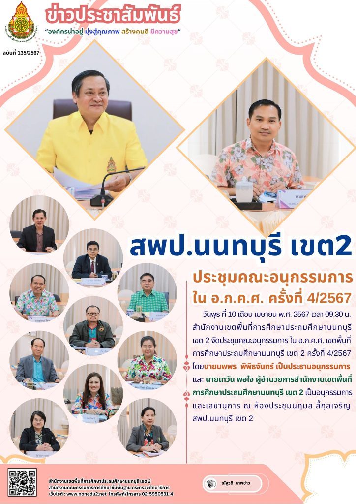 วันพุธ ที่ 10 เดือน เมษายน พ.ศ. 2567 เวลา 09.30 น. สำนักงานเขตพื้นที่การศึกษาประถมศึกษานนทบุรี เขต 2 จัดประชุมคณะอนุกรรมการ ใน อ.ก.ค.ศ. เขตพื้นที่การศึกษาประถมศึกษานนทบุรี เขต 2 ครั้งที่ 4/2567 โดยนายนพพร พิพิธจันทร์ เป็นประธานอนุกรรมการ และ นายเทวัน พอใจ ผู้อำนวยการสำนักงานเขตพื้นที่การศึกษาประถมศึกษานนทบุรี เขต 2 เป็นอนุกรรมการและเลขานุการ ณ ห้องประชุมนฤมล ลี้กุลเจริญ สพป.นนทบุรี เขต 2