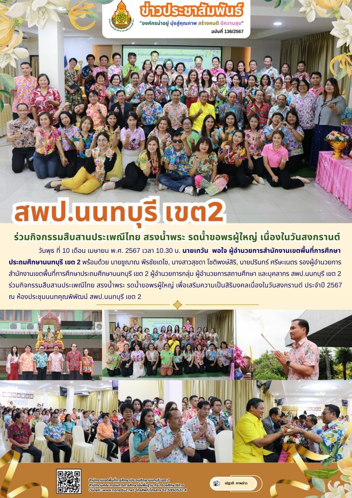วันพุธ ที่ 10 เดือน เมษายน พ.ศ. 2567 เวลา 10.30 น. นายเทวัน พอใจ ผู้อำนวยการสำนักงานเขตพื้นที่การศึกษาประถมศึกษานนทบุรี เขต 2 พร้อมด้วย นายชูฌาณ พีรชัยเดโช, นางสาวสุชดา โชติพงษ์สิริ, นายปรินทร์ ศรีษะเนตร รองผู้อำนวยการสำนักงานเขตพื้นที่การศึกษาประถมศึกษานนทบุรี เขต 2 ผู้อำนวยการกลุ่ม ผู้อำนวยการสถานศึกษา และบุคลากร สพป.นนทบุรี เขต 2 ร่วมกิจกรรมสืบสานประเพณีไทย สรงน้ำพระ รดน้ำขอพรผู้ใหญ่ เพื่อเสริมความเป็นสิริมงคลเนื่องในวันสงกรานต์ ประจำปี 2567 ณ ห้องประชุมนนทคุณพิพัฒน์ สพป.นนทบุรี เขต 2