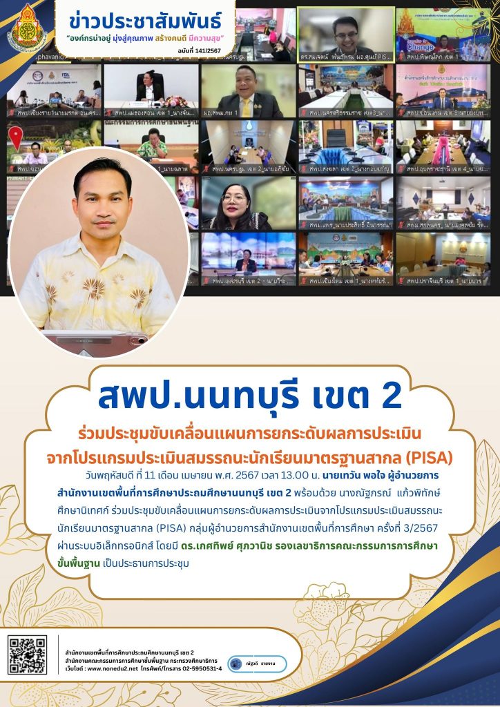 วันพฤหัสบดี ที่ 11 เดือน เมษายน พ.ศ. 2567 เวลา 13.00 น. นายเทวัน พอใจ ผู้อำนวยการสำนักงานเขตพื้นที่การศึกษาประถมศึกษานนทบุรี เขต 2 พร้อมด้วย นางณัฐภรณ์ แก้วพิทักษ์ ศึกษานิเทศก์ ร่วมประชุมขับเคลื่อนแผนการยกระดับผลการประเมินจากโปรแกรมประเมินสมรรถนะนักเรียนมาตรฐานสากล (PISA) กลุ่มผู้อำนวยการสำนักงานเขตพื้นที่การศึกษา ครั้งที่ 3/2567 ผ่านระบบอิเล็กทรอนิกส์ โดยมี ดร.เกศทิพย์ ศุภวานิช รองเลขาธิการคณะกรรมการการศึกษาขั้นพื้นฐาน เป็นประธานการประชุม