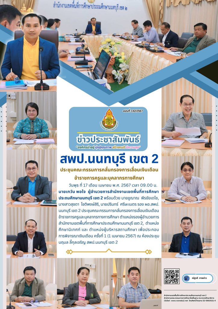 วันพุธ ที่ 17 เดือน เมษายน พ.ศ. 2567 เวลา 09.00 น. นายเทวัน พอใจ ผู้อำนวยการสำนักงานเขตพื้นที่การศึกษาประถมศึกษานนทบุรี เขต 2 พร้อมด้วย นายชูฌาณ พีรชัยเดโช, นางสาวสุชดา โชติพงษ์สิริ, นายปรินทร์ ศรีษะเนตร รอง ผอ.สพป.นนทบุรี เขต 2 ประชุมคณะกรรมการกลั่นกรองการเลื่อนเงินเดือนข้าราชการครูและบุคลากรทางการศึกษา ตำแหน่งรองผู้อำนวยการสำนักงานเขตพื้นที่การศึกษาประถมศึกษานนทบุรี เขต 2, ตำแหน่งศึกษานิเทศก์ และ ตำแหน่งผู้บริหารสถานศึกษา เพื่อประกอบการพิจารณาเงินเดือน ครั้งที่ 1 (1 เมษายน 2567) ณ ห้องประชุมนฤมล ลี้กุลเจริญ สพป.นนทบุรี เขต 2