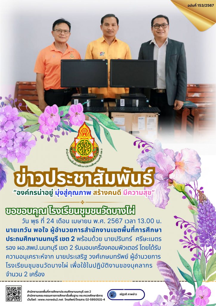 วัน พุธ ที่ 24 เดือน เมษายน พ.ศ. 2567 เวลา 13.00 น. นายเทวัน พอใจ ผู้อำนวยการสำนักงานเขตพื้นที่การศึกษาประถมศึกษานนทบุรี เขต 2 พร้อมด้วย นายปรินทร์ ศรีษะเนตร รอง ผอ.สพป.นนทบุรี เขต 2 รับมอบเครื่องคอมพิวเตอร์ โดยได้รับความอนุเคราะห์จาก นายประเสริฐ วงศ์เกษมทรัพย์ ผู้อำนวยการโรงเรียนชุมชนวัดบางไผ่ เพื่อใช้ในปฏิบัติงานของบุคลากร จำนวน 2 เครื่อง