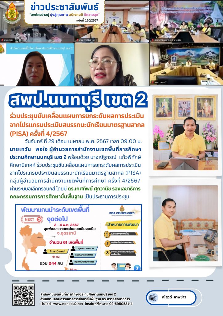 วันจันทร์ ที่ 29 เดือน เมษายน พ.ศ. 2567 เวลา 09.00 น. นายเทวัน พอใจ ผู้อำนวยการสำนักงานเขตพื้นที่การศึกษาประถมศึกษานนทบุรี เขต 2 พร้อมด้วย นางณัฐภรณ์ แก้วพิทักษ์ ศึกษานิเทศก์ ร่วมประชุมขับเคลื่อนแผนการยกระดับผลการประเมินจากโปรแกรมประเมินสมรรถนะนักเรียนมาตรฐานสากล (PISA) กลุ่มผู้อำนวยการสำนักงานเขตพื้นที่การศึกษา ครั้งที่ 4/2567 ผ่านระบบอิเล็กทรอนิกส์ โดยมี ดร.เกศทิพย์ ศุภวานิช รองเลขาธิการคณะกรรมการการศึกษาขั้นพื้นฐาน เป็นประธานการประชุม