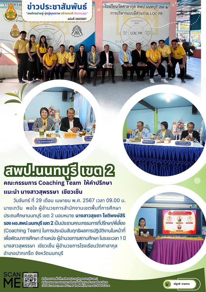 วันจันทร์ ที่ 29 เดือน เมษายน พ.ศ. 2567 เวลา 09.00 น. นายเทวัน พอใจ ผู้อำนวยการสำนักงานเขตพื้นที่การศึกษาประถมศึกษานนทบุรี เขต 2 มอบหมาย นางสาวสุชดา โชติพงษ์สิริ รอง ผอ.สพป.นนทบุรี เขต 2 เป็นประธานคณะกรรมการที่ปรึกษา/พี่เลี้ยง (Coaching Team) ในการประเมินสัมฤทธิผลการปฎิบัติงานในหน้าที่เพื่อพัฒนาการศึกษา ตำแหน่ง ผู้อำนวยการสถานศึกษา ในระยะเวลา 1 ปี นางสาวสุพรรษา เขียวเซ็น ผู้อำนวยการโรงเรียนวัดศาลากุล อำเภอปากเกร็ด จังหวัดนนทบุรี