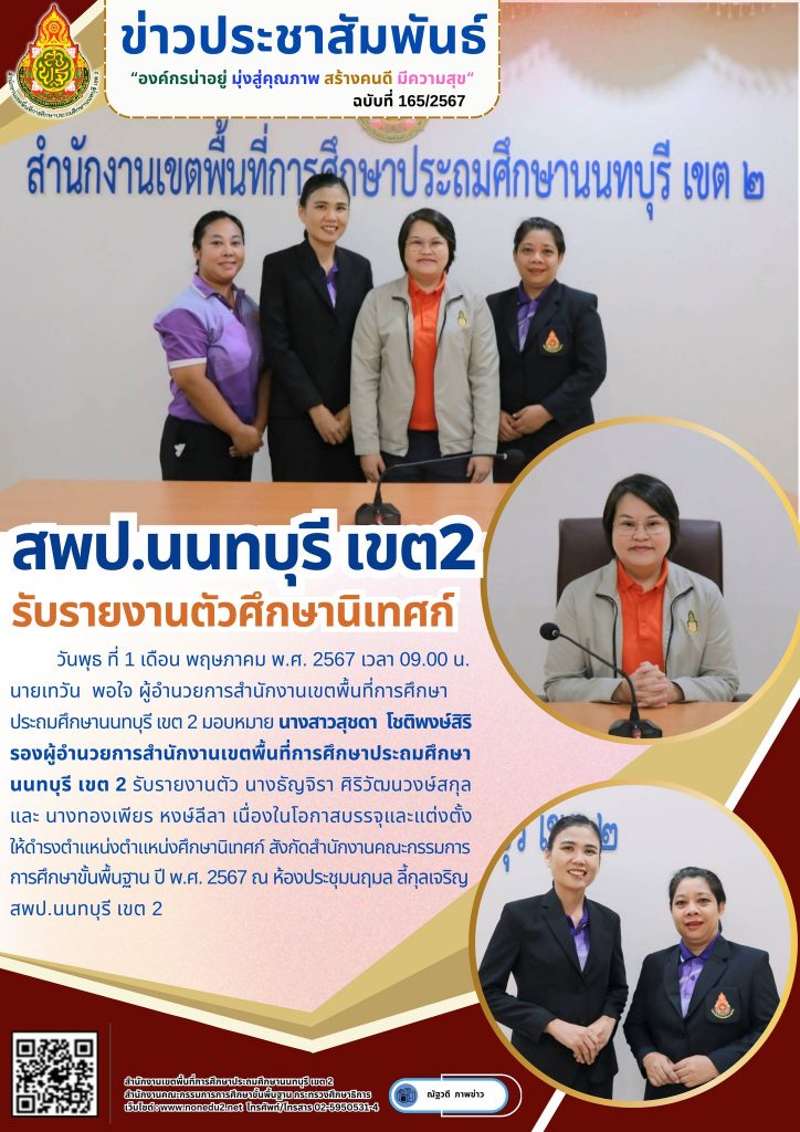 วันพุธ ที่ 1 เดือน พฤษภาคม พ.ศ. 2567 เวลา 09.00 น. นายเทวัน พอใจ ผู้อำนวยการสำนักงานเขตพื้นที่การศึกษาประถมศึกษานนทบุรี เขต 2 มอบหมาย นางสาวสุชดา โชติพงษ์สิริ รองผู้อำนวยการสำนักงานเขตพื้นที่การศึกษาประถมศึกษานนทบุรี เขต 2 รับรายงานตัว นางธัญจิรา ศิริวัฒนวงษ์สกุล และ นางทองเพียร หงษ์ลีลา เนื่องในโอกาสบรรจุและแต่งตั้งให้ดำรงตำแหน่งตำแหน่งศึกษานิเทศก์ สังกัดสำนักงานคณะกรรมการการศึกษาขั้นพื้นฐาน ปี พ.ศ. 2567 ณ ห้องประชุมนฤมล ลี้กุลเจริญ สพป.นนทบุรี เขต 2