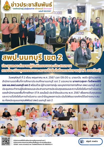 วันพฤหัสบดี ที่ 2 เดือน พฤษภาคม พ.ศ. 2567 เวลา 09.00 น. นายเทวัน พอใจ ผู้อำนวยการ สำนักงานเขตพื้นที่การศึกษาประถมศึกษานนทบุรี เขต 2 มอบหมาย นางสาวสุชดา โชติพงษ์สิริ รอง ผอ.สพป.นนทบุรี เขต 2 พร้อมด้วย ผู้อำนวยการกลุ่ม และบุคลากรทางการศึกษา สพป.นนทบุรี เขต 2 ประชุมคณะทำงานผู้รับผิดชอบและประสานงานการประเมินคุณธรรมและความโปร่งใสในการดำเนินงาน ของสำนักงานเขตพื้นที่การศึกษา (ITA ออนไลน์) ประจำปีงบประมาณ พ.ศ. 2567 เพื่อยกระดับคุณธรรมและความโปร่งใสในการดำเนินงาน และนำข้อมูลผลการประเมินไปพัฒนาองค์กรได้อย่างเหมาะสม ณ ห้องประชุมนนทคุณพิพัฒน์ สพป.นนทบุรี เขต 2