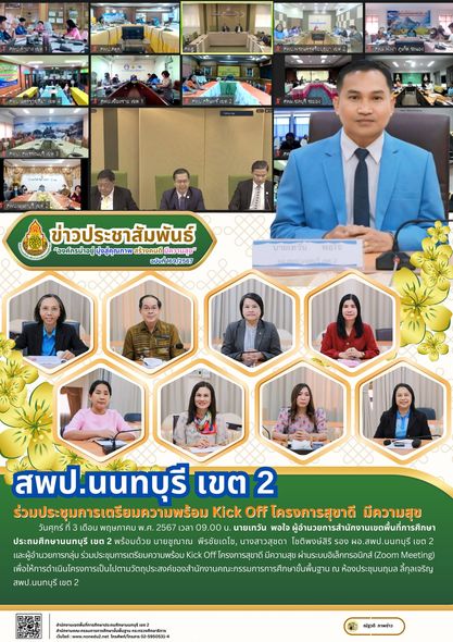 วันศุกร์ ที่ 3 เดือน พฤษภาคม พ.ศ. 2567 เวลา 09.00 น. นายเทวัน พอใจ ผู้อำนวยการสำนักงานเขตพื้นที่การศึกษาประถมศึกษานนทบุรี เขต 2 พร้อมด้วย นายชูฌาณ พีรชัยเดโช, นางสาวสุชดา โชติพงษ์สิริ รอง ผอ.สพป.นนทบุรี เขต 2 และผู้อำนวยการกลุ่ม ร่วมประชุมการเตรียมความพร้อม Kick Off โครงการสุขาดี มีความสุข ผ่านระบบอิเล็กทรอนิกส์ (Zoom Meeting) เพื่อให้การดำเนินโครงการเป็นไปตามวัตถุประสงค์ของสำนักงานคณะกรรมการการศึกษาขั้นพื้นฐาน ณ ห้องประชุมนฤมล ลี้กุลเจริญ สพป.นนทบุรี เขต 2