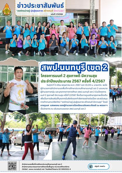 วันศุกร์ ที่ 3 เดือน พฤษภาคม พ.ศ. 2567 เวลา 15.00 น. นายเทวัน พอใจ ผู้อำนวยการสำนักงานเขตพื้นที่การศึกษาประถมศึกษานนทบุรี เขต 2 มอบหมาย ผู้อำนวยการกลุ่ม และบุคลากรทางการศึกษา สพป.นนทบุรี เขต 2 ร่วมโครงการ นนท์ 2 สุขภาพดี มีความสุข ครั้งที่ 2/2567 ซึ่งเป็นการดูแลรักษาสุขภาพเบื้องต้น เพื่อเป็นการส่งเสริมให้บุคลากรในสังกัดออกกำลังกายอย่างต่อเนื่อง และสนับสนุนการทำงานตามวิสัยทัศน์ “องค์กรน่าอยู่ มุ่งสู่คุณภาพ สร้างคนดี มีความสุข” โดยมี นายภูเมศ แสงพรหม รองผู้อำนวยการโรงเรียนเฉลิมพระเกียรติ ๖๐ พรรษา ฯ เป็นวิทยากร ณ บริเวณลานจอดรถ สพป.นนทบุรี เขต 2