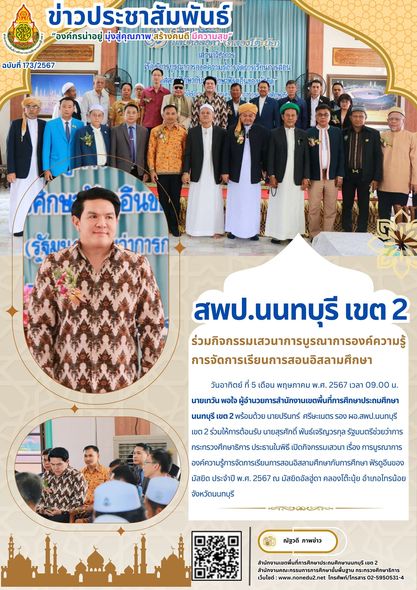 วันอาทิตย์ ที่ 5 เดือน พฤษภาคม พ.ศ. 2567 เวลา 09.00 น. นายเทวัน พอใจ ผู้อำนวยการสำนักงานเขตพื้นที่การศึกษาประถมศึกษานนทบุรี เขต 2 พร้อมด้วย นายปรินทร์ ศรีษะเนตร รอง ผอ.สพป.นนทบุรี เขต 2 ร่วมให้การต้อนรับ นายสุรศักดิ์ พันธ์เจริญวรกุล รัฐมนตรีช่วยว่าการกระทรวงศึกษาธิการ ประธานในพิธี เปิดกิจกรรมเสวนา เรื่อง การบูรณาการองค์ความรู้การจัดการเรียนการสอนอิสลามศึกษากับการศึกษา ฟัรดูอีนของมัสยิด ประจำปี พ.ศ. 2567 ณ มัสยิดอัลฮู่ดา คลองโต๊ะนุ้ย อำเภอไทรน้อย จังหวัดนนทบุรี