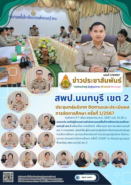 วันอังคาร ที่ 7 เดือน พฤษภาคม พ.ศ. 2567 เวลา 13.30 น. นายเทวัน พอใจผู้อำนวยการสำนักงานเขตพื้นที่การศึกษาประถมศึกษานนทบุรี เขต 2 พร้อมด้วย นายปรินทร์ ศรีษะเนตร รอง ผอ.สพป.นนทบุรี เขต 2 นางนภสกร ผ่องอำไพ ผู้อำนวยการกลุ่มนิเทศ ติดตามและประเมินผลการจัดการศึกษา และคณะศึกษานิเทศก์ ร่วมประชุมกลุ่มนิเทศ ติดตามและประเมินผลการจัดการศึกษา ครั้งที่ 1/2567 ณ ห้องประชุมนฤมล ลี้กุลเจริญ สพป.นนทบุรี เขต 2