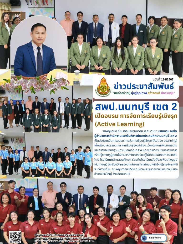 วันพฤหัสบดี ที่ 9 เดือน พฤษภาคม พ.ศ. 2567 นายเทวัน พอใจ ผู้อำนวยการสำนักงานเขตพื้นที่การศึกษาประถมศึกษานนทบุรี เขต 2 เป็นประธานเปิดการอบรม การจัดการเรียนรู้เชิงรุก (Active Learning) เพื่อพัฒนาสมรรถนะและการเรียนรู้ของผู้เรียน เชื่อมโยงการพัฒนาผลงานและการขอมีวิทยฐานะตามหลักเกณฑ์ PA และพัฒนากระบวนการจัดการเรียนรู้ของครูผู้สอนให้สามารถจัดการเรียนรู้ให้เกิดประสิทธิภาพมากขึ้น โดย โรงเรียนคล้ายสอนศึกษา ร่วมกับโรงเรียนวัดสังวรพิมลไพบูลย์(จันทานุกูล) โรงเรียนวัดคลองตาคล้าย และโรงเรียนบางรักใหญ่(สายอักษรศรี) ระหว่างวันที่ 9 – 10 พฤษภาคม 2567 ณ ห้องประชุมเทศบาลเมืองบางแม่นาง อำเภอบางใหญ่ จังหวัดนนทบุรี