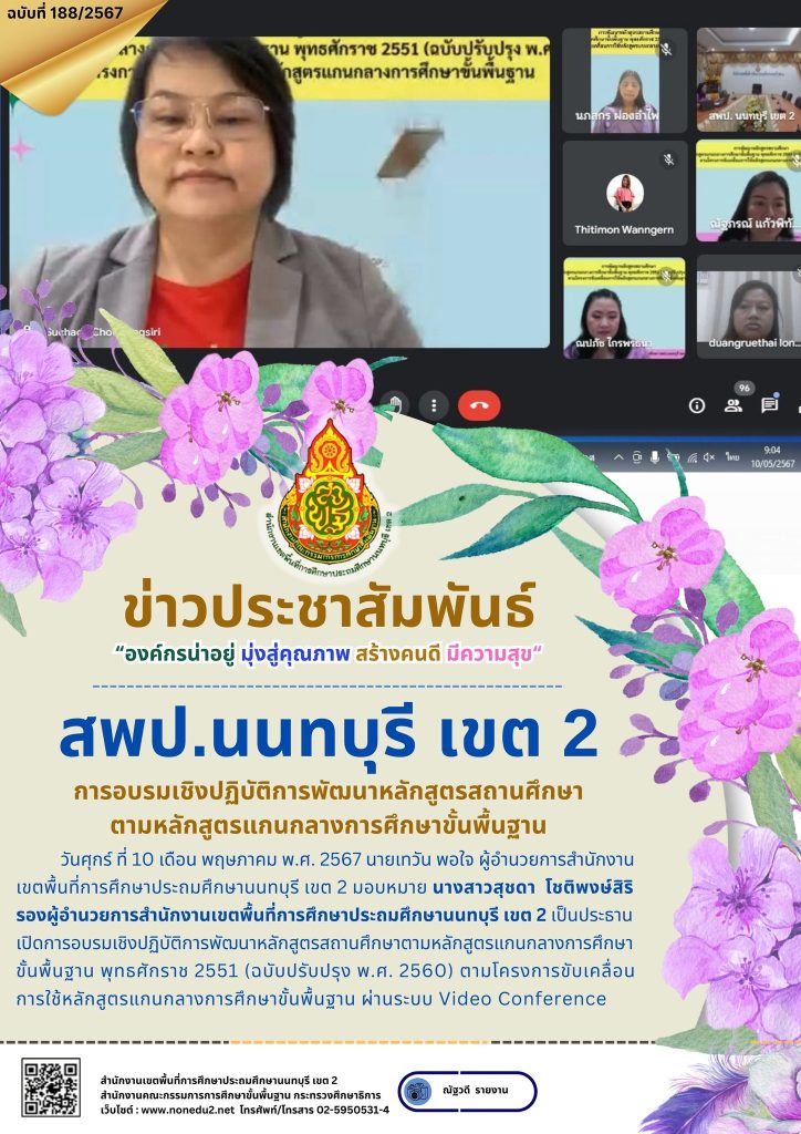 วันศุกร์ ที่ 10 เดือน พฤษภาคม พ.ศ. 2567 นายเทวัน พอใจ ผู้อำนวยการสำนักงานเขตพื้นที่การศึกษาประถมศึกษานนทบุรี เขต 2 มอบหมาย นางสาวสุชดา โชติพงษ์สิริ รองผู้อำนวยการสำนักงานเขตพื้นที่การศึกษาประถมศึกษานนทบุรี เขต 2 เป็นประธานเปิดการอบรมเชิงปฏิบัติการพัฒนาหลักสูตรสถานศึกษาตามหลักสูตรแกนกลางการศึกษาขั้นพื้นฐาน พุทธศักราช 2551 (ฉบับปรับปรุง พ.ศ. 2560) ตามโครงการขับเคลื่อนการใช้หลักสูตรแกนกลางการศึกษาขั้นพื้นฐาน ผ่านระบบ Video Conference