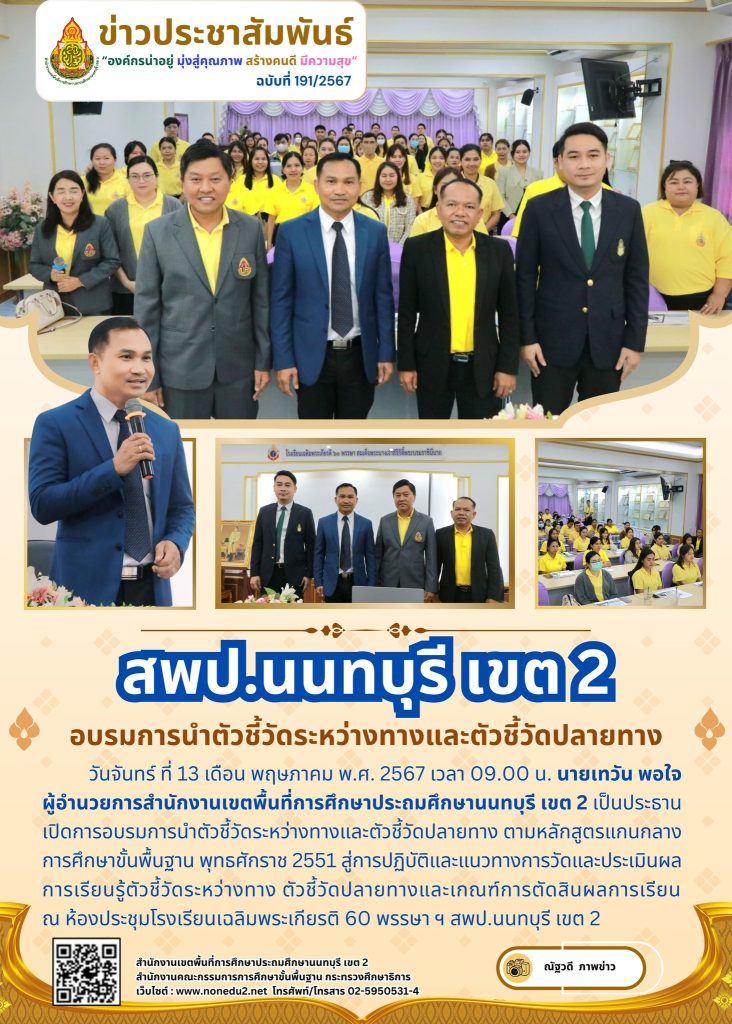 วันจันทร์ ที่ 13 เดือน พฤษภาคม พ.ศ. 2567 เวลา 09.00 น. นายเทวัน พอใจ ผู้อำนวยการสำนักงานเขตพื้นที่การศึกษาประถมศึกษานนทบุรี เขต 2 เป็นประธานเปิดการอบรมการนำตัวชี้วัดระหว่างทางและตัวชี้วัดปลายทาง ตามหลักสูตรแกนกลางการศึกษาขั้นพื้นฐาน พุทธศักราช 2551 สู่การปฏิบัติและแนวทางการวัดและประเมินผลการเรียนรู้ตัวชี้วัดระหว่างทาง ตัวชี้วัดปลายทางและเกณฑ์การตัดสินผลการเรียน ณ ห้องประชุมโรงเรียนเฉลิมพระเกียรติ 60 พรรษา ฯ สพป.นนทบุรี เขต 2
