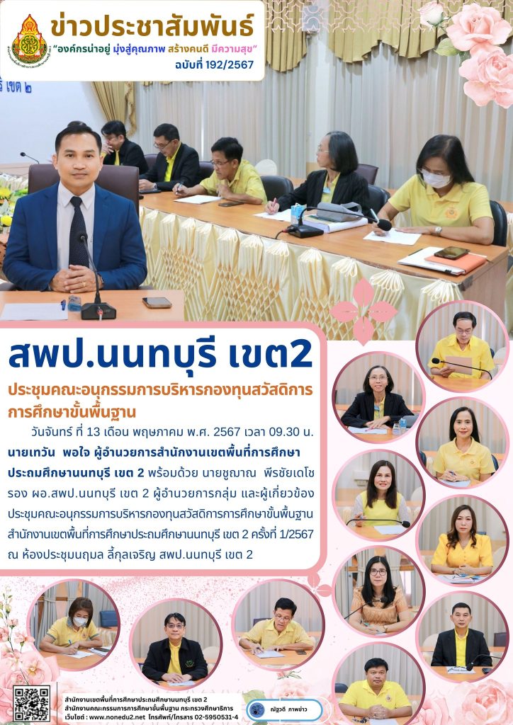 วันจันทร์ ที่ 13 เดือน พฤษภาคม พ.ศ. 2567 เวลา 09.30 น. นายเทวัน พอใจ ผู้อำนวยการสำนักงานเขตพื้นที่การศึกษาประถมศึกษานนทบุรี เขต 2 พร้อมด้วย นายชูฌาณ พีรชัยเดโช รอง ผอ.สพป.นนทบุรี เขต 2 ผู้อำนวยการกลุ่ม และผู้เกี่ยวข้อง ประชุมคณะอนุกรรมการบริหารกองทุนสวัสดิการการศึกษาขั้นพื้นฐานสำนักงานเขตพื้นที่การศึกษาประถมศึกษานนทบุรี เขต 2 ครั้งที่ 1/2567 ณ ห้องประชุมนฤมล ลี้กุลเจริญ สพป.นนทบุรี เขต 2