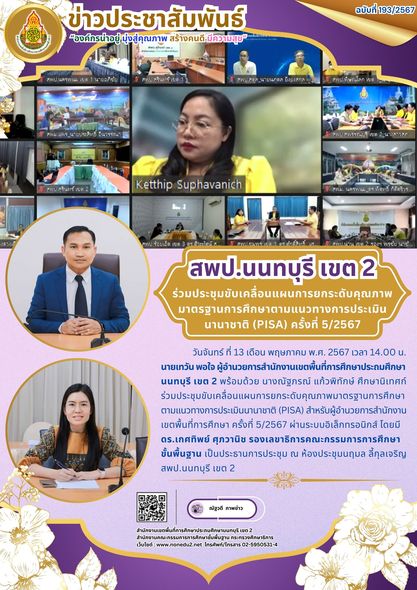 วันจันทร์ ที่ 13 เดือน พฤษภาคม พ.ศ. 2567 เวลา 14.00 น. นายเทวัน พอใจ ผู้อำนวยการสำนักงานเขตพื้นที่การศึกษาประถมศึกษานนทบุรี เขต 2 พร้อมด้วย นางณัฐภรณ์ แก้วพิทักษ์ ศึกษานิเทศก์ ร่วมประชุมขับเคลื่อนแผนการยกระดับคุณภาพมาตรฐานการศึกษาตามแนวทางการประเมินนานาชาติ (PISA) สำหรับผู้อำนวยการสำนักงานเขตพื้นที่การศึกษา ครั้งที่ 5/2567 ผ่านระบบอิเล็กทรอนิกส์ โดยมี ดร.เกศทิพย์ ศุภวานิช รองเลขาธิการคณะกรรมการการศึกษาขั้นพื้นฐาน เป็นประธานการประชุม ณ ห้องประชุมนฤมล ลี้กุลเจริญ สพป.นนทบุรี เขต 2