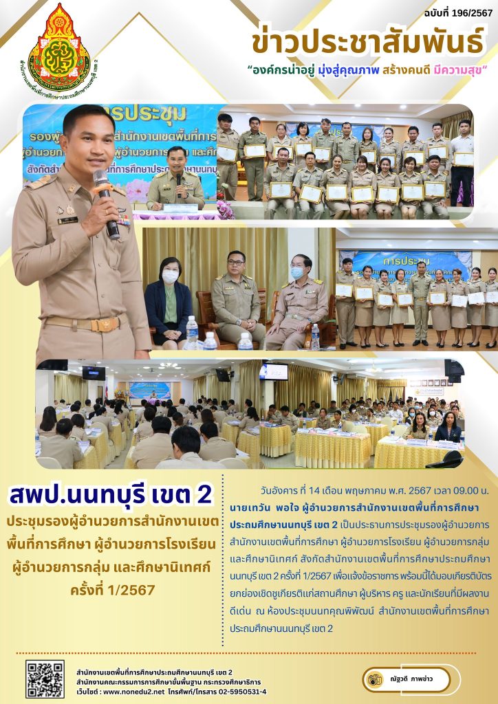 วันอังคาร ที่ 14 เดือน พฤษภาคม พ.ศ. 2567 เวลา 09.00 น. นายเทวัน พอใจ ผู้อำนวยการสำนักงานเขตพื้นที่การศึกษาประถมศึกษานนทบุรี เขต 2 เป็นประธานการประชุมรองผู้อำนวยการสำนักงานเขตพื้นที่การศึกษา ผู้อำนวยการโรงเรียน ผู้อำนวยการกลุ่ม และศึกษานิเทศก์ สังกัดสำนักงานเขตพื้นที่การศึกษาประถมศึกษานนทบุรี เขต 2 ครั้งที่ 1/2567 เพื่อแจ้งข้อราชการ พร้อมนี้ได้มอบเกียรติบัตรยกย่องเชิดชูเกียรติแก่สถานศึกษา ผู้บริหาร ครู และนักเรียนที่มีผลงานดีเด่น ณ ห้องประชุมนนทคุณพิพัฒน์ สำนักงานเขตพื้นที่การศึกษาประถมศึกษานนนทบุรี เขต 2