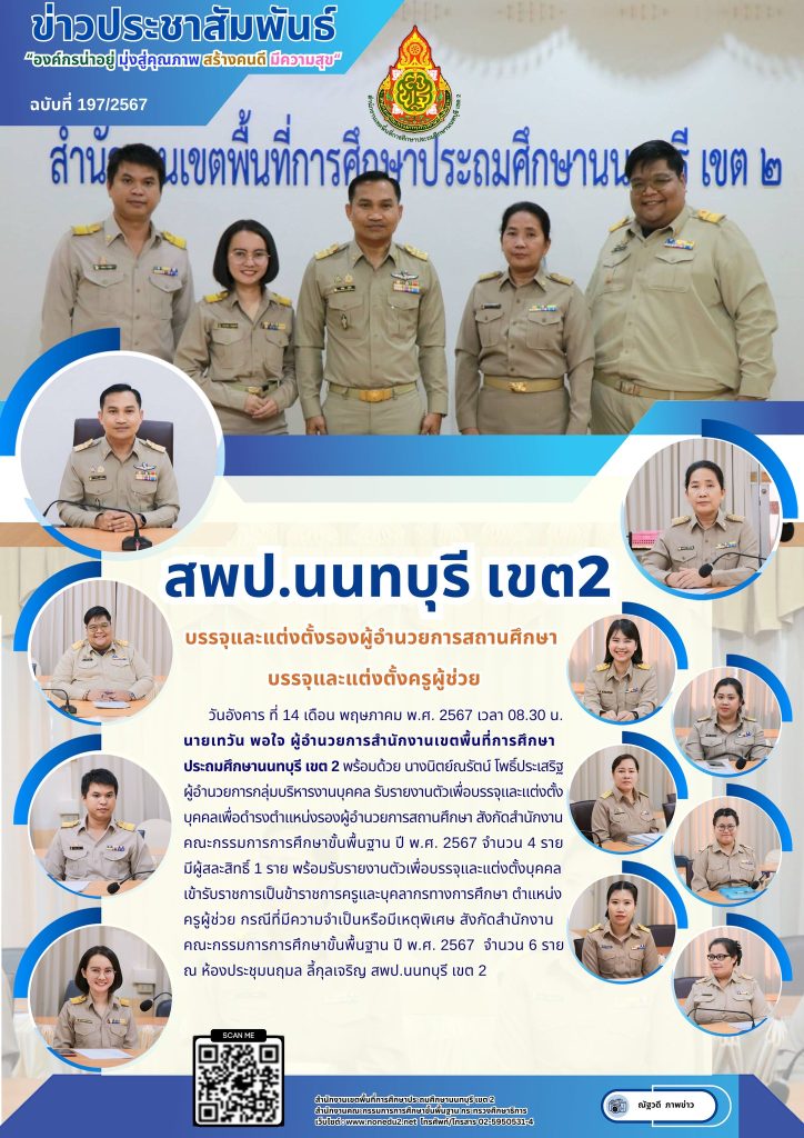 วันอังคาร ที่ 14 เดือน พฤษภาคม พ.ศ. 2567 เวลา 08.30 น. นายเทวัน พอใจ ผู้อำนวยการสำนักงานเขตพื้นที่การศึกษาประถมศึกษานนทบุรี เขต 2 พร้อมด้วย นางนิตย์ณรัตน์ โพธิ์ประเสริฐ ผู้อำนวยการกลุ่มบริหารงานบุคคล รับรายงานตัวเพื่อบรรจุและแต่งตั้งบุคคลเพื่อดำรงตำแหน่งรองผู้อำนวยการสถานศึกษา สังกัดสำนักงานคณะกรรมการการศึกษาขั้นพื้นฐาน ปี พ.ศ. 2567 จำนวน 4 ราย มีผู้สละสิทธิ์ 1 ราย พร้อมรับรายงานตัวเพื่อบรรจุและแต่งตั้งบุคคลเข้ารับราชการเป็นข้าราชการครูและบุคลากรทางการศึกษา ตำแหน่ง ครูผู้ช่วย กรณีที่มีความจำเป็นหรือมีเหตุพิเศษ สังกัดสำนักงานคณะกรรมการการศึกษาขั้นพื้นฐาน ปี พ.ศ. 2567 จำนวน 6 ราย ณ ห้องประชุมนฤมล ลี้กุลเจริญ สพป.นนทบุรี เขต 2