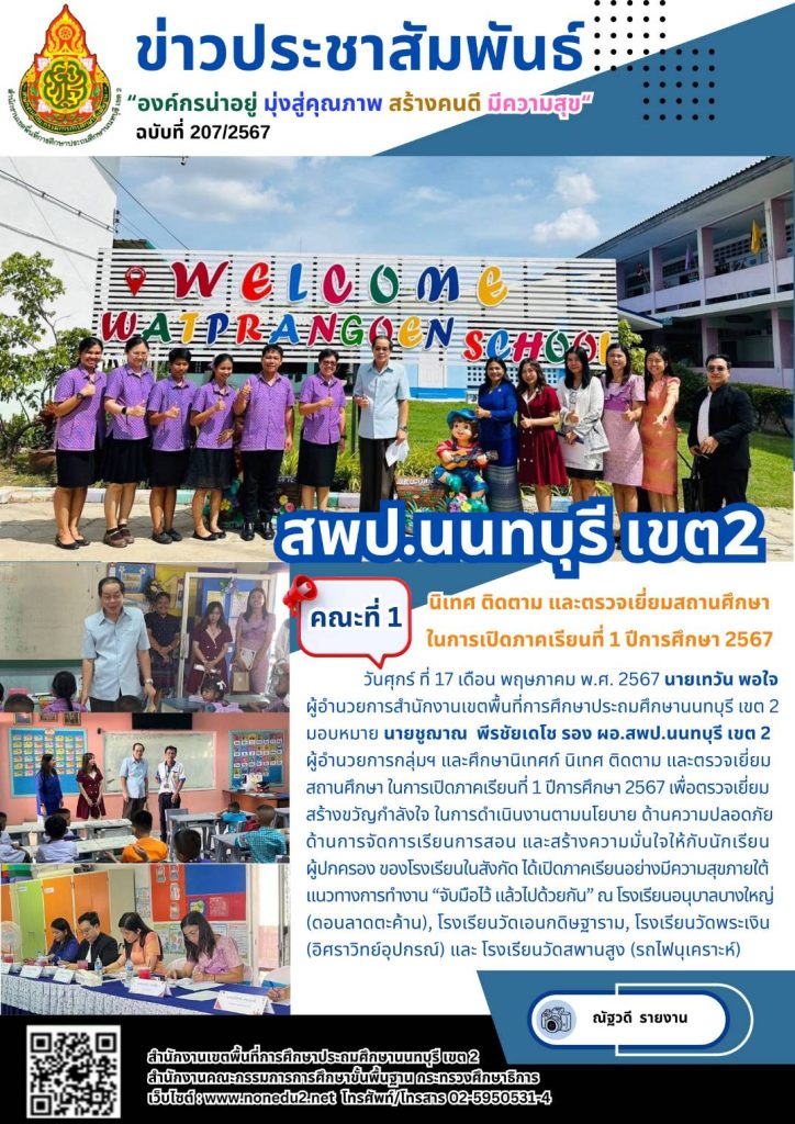 วันศุกร์ ที่ 17 เดือน พฤษภาคม พ.ศ. 2567 นายเทวัน พอใจ ผู้อำนวยการสำนักงานเขตพื้นที่การศึกษาประถมศึกษานนทบุรี เขต 2 มอบหมาย นายชูฌาณ พีรชัยเดโช รอง ผอ.สพป.นนทบุรี เขต 2 ผู้อำนวยการกลุ่มฯ และศึกษานิเทศก์ นิเทศ ติดตาม และตรวจเยี่ยมสถานศึกษา ในการเปิดภาคเรียนที่ 1 ปีการศึกษา 2567 เพื่อตรวจเยี่ยมสร้างขวัญกำลังใจ ในการดำเนินงานตามนโยบาย ด้านความปลอดภัย ด้านการจัดการเรียนการสอน และสร้างความมั่นใจให้กับนักเรียน ผู้ปกครอง ของโรงเรียนในสังกัด ได้เปิดภาคเรียนอย่างมีความสุขภายใต้แนวทางการทำงาน “จับมือไว้ แล้วไปด้วยกัน” ณ โรงเรียนอนุบาลบางใหญ่ (ดอนลาดตะค้าน), โรงเรียนวัดเอนกดิษฐาราม, โรงเรียนวัดพระเงิน (อิศราวิทย์อุปกรณ์) และ โรงเรียนวัดสพานสูง (รถไฟนุเคราะห์)