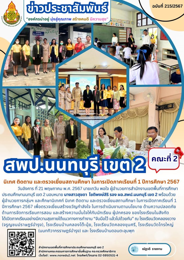 วันอังคาร ที่ 21 พฤษภาคม พ.ศ. 2567 นายเทวัน พอใจ ผู้อำนวยการสำนักงานเขตพื้นที่การศึกษาประถมศึกษานนทบุรี เขต 2 มอบหมาย นางสาวสุชดา โชติพงษ์สิริ รอง ผอ.สพป.นนทบุรี เขต 2 พร้อมด้วย ผู้อำนวยการกลุ่มฯ และศึกษานิเทศก์ นิเทศ ติดตาม และตรวจเยี่ยมสถานศึกษา ในการเปิดภาคเรียนที่ 1 ปีการศึกษา 2567 เพื่อตรวจเยี่ยมสร้างขวัญกำลังใจ ในการดำเนินงานตามนโยบาย ด้านความปลอดภัย ด้านการจัดการเรียนการสอน และสร้างความมั่นใจให้กับนักเรียน ผู้ปกครอง ของโรงเรียนในสังกัด ได้เปิดภาคเรียนอย่างมีความสุขภายใต้แนวทางการทำงาน “จับมือไว้ แล้วไปด้วยกัน” ณ โรงเรียนวัดคลองขวาง (จรูญชนม์ราษฎร์บำรุง), โรงเรียนบ้านคลองโต๊ะนุ้ย, โรงเรียนบ้านคลองขุนศรี, โรงเรียนวัดไทรใหญ่ (นนททิวากรราษฎร์บำรุง) และ โรงเรียนบ้านดอนตะลุมพุก