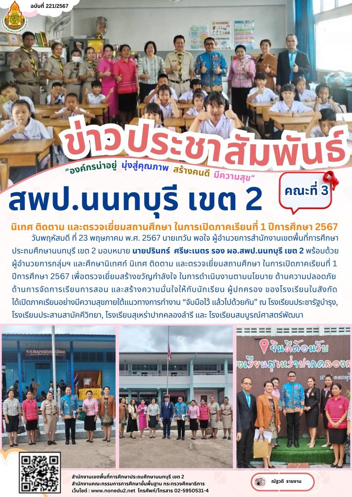 วันพฤหัสบดี ที่ 23 พฤษภาคม พ.ศ. 2567 นายเทวัน พอใจ ผู้อำนวยการสำนักงานเขตพื้นที่การศึกษาประถมศึกษานนทบุรี เขต 2 มอบหมาย นายปรินทร์ ศรีษะเนตร รอง ผอ.สพป.นนทบุรี เขต 2 พร้อมด้วย ผู้อำนวยการกลุ่มฯ และศึกษานิเทศก์ นิเทศ ติดตาม และตรวจเยี่ยมสถานศึกษา ในการเปิดภาคเรียนที่ 1 ปีการศึกษา 2567 เพื่อตรวจเยี่ยมสร้างขวัญกำลังใจ ในการดำเนินงานตามนโยบาย ด้านความปลอดภัย ด้านการจัดการเรียนการสอน และสร้างความมั่นใจให้กับนักเรียน ผู้ปกครอง ของโรงเรียนในสังกัด ได้เปิดภาคเรียนอย่างมีความสุขภายใต้แนวทางการทำงาน “จับมือไว้ แล้วไปด้วยกัน” ณ โรงเรียนประชารัฐบำรุง, โรงเรียนประสานสามัคคีวิทยา, โรงเรียนสุเหร่าปากคลองลำรี และ โรงเรียนสมบูรณ์ศาสตร์พัฒนา