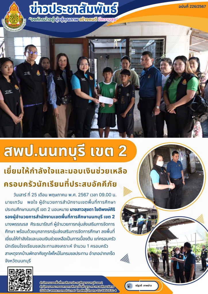 วันเสาร์ ที่ 25 เดือน พฤษภาคม พ.ศ. 2567 เวลา 09.00 น. นายเทวัน พอใจ ผู้อำนวยการสำนักงานเขตพื้นที่การศึกษาประถมศึกษานนทบุรี เขต 2 มอบหมาย นางสาวสุชดา โชติพงษ์ศิริ รองผู้อำนวยการสำนักงานเขตพื้นที่การศึกษานนทบุรี เขต 2 นางพรรณรส ศิระธนารัณฑ์ ผู้อำนวยการกลุ่มส่งเสริมการจัดการศึกษา พร้อมด้วยบุคลากรกลุ่มส่งเสริมการจัดการศึกษา ลงพื้นที่เยี่ยมให้กำลังใจและมอบเงินช่วยเหลือเป็นการเบื้องต้น แก่ครอบครัวนักเรียนโรงเรียนชลประทานสงเคราะห์ จำนวน 1 ครอบครัว สาเหตุจากบ้านพักอาศัยถูกไฟไหม้ในกรมชลประทาน อำเภอปากเกร็ด จังหวัดนนทบุรี