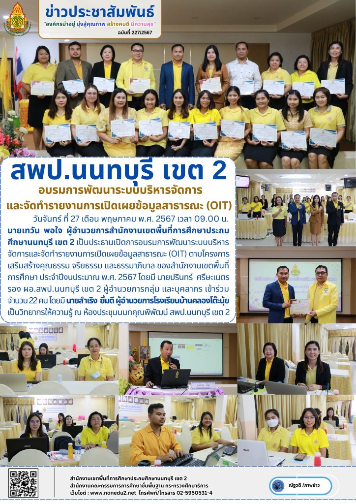 วันจันทร์ ที่ 27 เดือน พฤษภาคม พ.ศ. 2567 เวลา 09.00 น. นายเทวัน พอใจ ผู้อำนวยการสำนักงานเขตพื้นที่การศึกษาประถมศึกษานนทบุรี เขต 2 เป็นประธานเปิดการอบรมการพัฒนาระบบบริหารจัดการและจัดทำรายงานการเปิดเผยข้อมูลสาธารณะ (OIT) ตามโครงการเสริมสร้างคุณธรรม จริยธรรม และธรรมาภิบาล ของสำนักงานเขตพื้นที่การศึกษา ประจำปีงบประมาณ พ.ศ. 2567 โดยมี นายปรินทร์ ศรีษะเนตร รอง ผอ.สพป.นนทบุรี เขต 2 ผู้อำนวยการกลุ่ม และบุคลากร เข้าร่วมจำนวน 22 คน โดยมี นายสำเริง ยิ้มดี ผู้อำนวยการโรงเรียนบ้านคลองโต๊ะนุ้ย เป็นวิทยากรให้ความรู้ ณ ห้องประชุมนนทคุณพิพัฒน์ สพป.นนทบุรี เขต 2