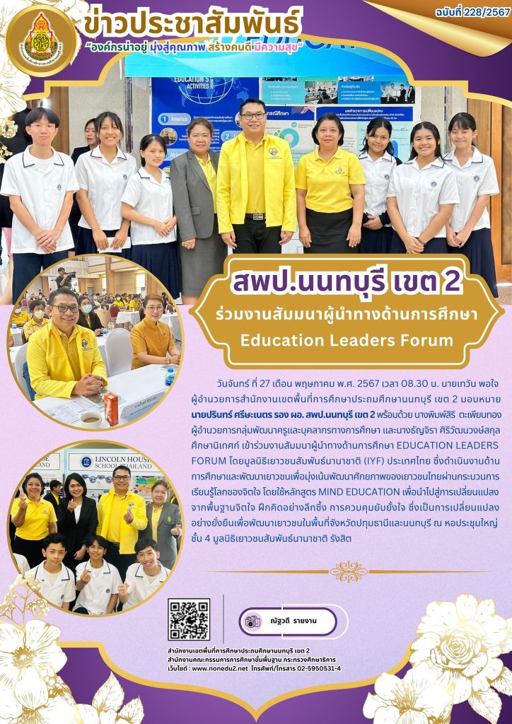 วันจันทร์ ที่ 27 เดือน พฤษภาคม พ.ศ. 2567 เวลา 08.30 น. นายเทวัน พอใจ ผู้อำนวยการสำนักงานเขตพื้นที่การศึกษาประถมศึกษานนทบุรี เขต 2 มอบหมาย นายปรินทร์ ศรีษะเนตร รอง ผอ. สพป.นนทบุรี เขต 2 พร้อมด้วย นางพิมพ์สิริ ตะเพียนทอง ผู้อำนวยการกลุ่มพัฒนาครูและบุคลากรทางการศึกษา และนางธัญจิรา ศิริวัฒนวงษ์สกุล ศึกษานิเทศก์ เข้าร่วมงานสัมมนาผู้นำทางด้านการศึกษา Education Leaders Forum โดยมูลนิธิเยาวชนสัมพันธ์นานาชาติ (IYF) ประเทศไทย ซึ่งดำเนินงานด้านการศึกษาและพัฒนาเยาวชนเพื่อมุ่งเน้นพัฒนาศักยภาพของเยาวชนไทยผ่านกระบวนการเรียนรู้โลกของจิตใจ โดยใช้หลักสูตร Mind Education เพื่อนำไปสู่การเปลี่ยนแปลงจากพื้นฐานจิตใจ ฝึกคิดอย่างลึกซึ้ง การควบคุมยับยั้งใจ ซึ่งเป็นการเปลี่ยนแปลงอย่างยั่งยืนเพื่อพัฒนาเยาวชนในพื้นที่จังหวัดปทุมธานีและนนทบุรี ณ หอประชุมใหญ่ชั้น 4 มูลนิธิเยาวชนสัมพันธ์นานาชาติ รังสิต