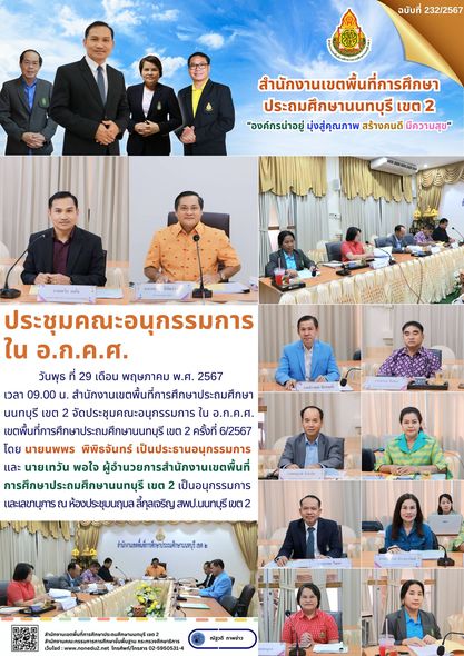 วันพุธ ที่ 29 เดือน พฤษภาคม พ.ศ. 2567 เวลา 09.00 น. สำนักงานเขตพื้นที่การศึกษาประถมศึกษานนทบุรี เขต 2 จัดประชุมคณะอนุกรรมการ ใน อ.ก.ค.ศ. เขตพื้นที่การศึกษาประถมศึกษานนทบุรี เขต 2 ครั้งที่ 6/2567 โดย นายนพพร พิพิธจันทร์ เป็นประธานอนุกรรมการ และ นายเทวัน พอใจ ผู้อำนวยการสำนักงานเขตพื้นที่การศึกษาประถมศึกษานนทบุรี เขต 2 เป็นอนุกรรมการและเลขานุการ ณ ห้องประชุมนฤมล ลี้กุลเจริญ สพป.นนทบุรี เขต 2