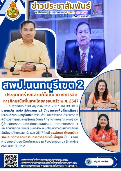 วันพฤหัสบดี ที่ 30 พฤษภาคม พ.ศ. 2567 เวลา 09.00 น. นายเทวัน พอใจ ผู้อำนวยการสำนักงานเขตพื้นที่การศึกษาประถมศึกษานนทบุรี เขต 2 พร้อมด้วย นางพรรณรส ศิระธนารัณฑ์ ผู้อำนวยการกลุ่มส่งเสริมการจัดการศึกษา นางนภสกร ผ่องอำไพ ผู้อำนวยการกลุ่มนิเทศ ติดตามและประเมินผลการจัดการศึกษา และศึกษานิเทศก์ ร่วมประชุมยกร่างและแก้ไขแนวทางการจัดการศึกษาขั้นพื้นฐานโดยครอบครัว พ.ศ. 2547 โดยมี ดร.พัฒนะ พัฒนทวีดล รองเลขาธิการคณะกรรมการการศึกษาขั้นพื้นฐาน เป็นประธาน ผ่านระบบ Video Conference ณ ห้องประชุมนฤมล ลี้กุลเจริญ สพป.นนทบุรี เขต 2