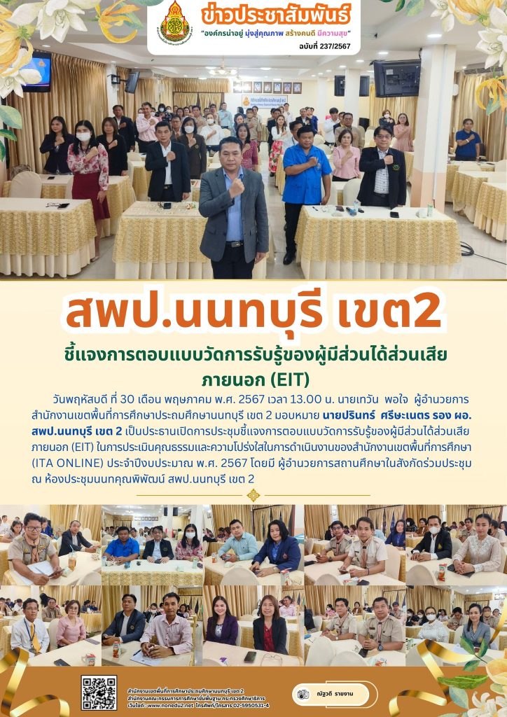 วันพฤหัสบดี ที่ 30 เดือน พฤษภาคม พ.ศ. 2567 เวลา 13.00 น. นายเทวัน พอใจ ผู้อำนวยการสำนักงานเขตพื้นที่การศึกษาประถมศึกษานนทบุรี เขต 2 มอบหมาย นายปรินทร์ ศรีษะเนตร รอง ผอ.สพป.นนทบุรี เขต 2 เป็นประธานเปิดการประชุมชี้แจงการตอบแบบวัดการรับรู้ของผู้มีส่วนได้ส่วนเสียภายนอก (EIT) ในการประเมินคุณธรรมและความโปร่งใสในการดำเนินงานของสำนักงานเขตพื้นที่การศึกษา (ITA ONLINE) ประจำปีงบประมาณ พ.ศ. 2567 โดยมี ผู้อำนวยการสถานศึกษาในสังกัดร่วมประชุม ณ ห้องประชุมนนทคุณพิพัฒน์ สพป.นนทบุรี เขต 2