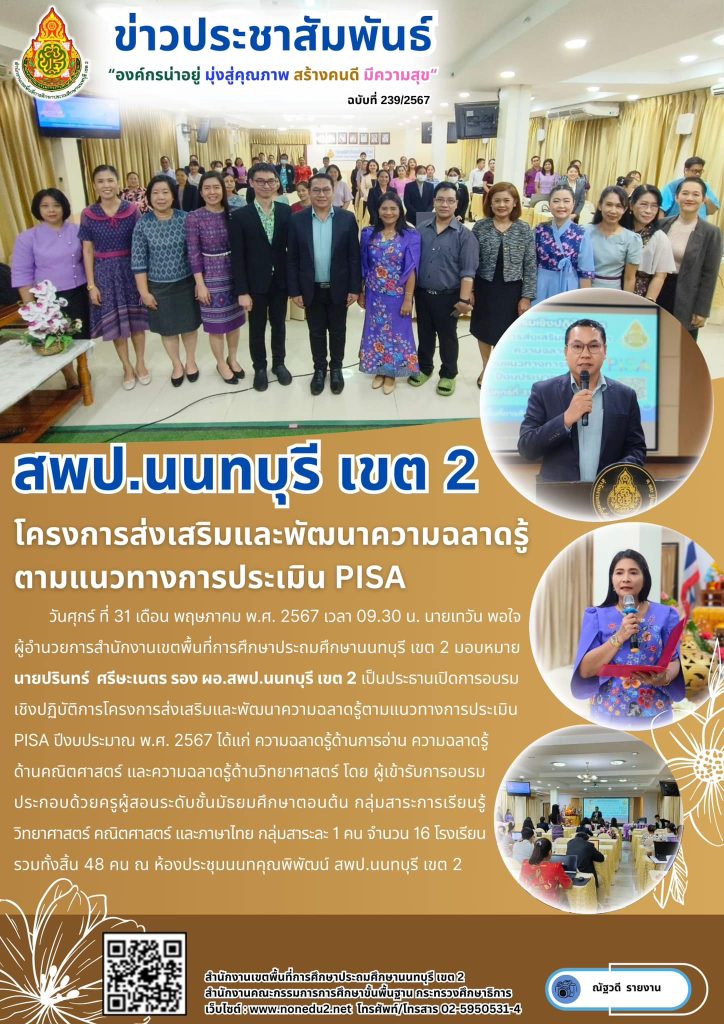 วันศุกร์ ที่ 31 เดือน พฤษภาคม พ.ศ. 2567 เวลา 09.30 น. นายเทวัน พอใจ ผู้อำนวยการสำนักงานเขตพื้นที่การศึกษาประถมศึกษานนทบุรี เขต 2 มอบหมาย นายปรินทร์ ศรีษะเนตร รอง ผอ.สพป.นนทบุรี เขต 2 เป็นประธานเปิดการอบรมเชิงปฏิบัติการโครงการส่งเสริมและพัฒนาความฉลาดรู้ตามแนวทางการประเมิน PISA ปีงบประมาณ พ.ศ. 2567 ได้แก่ ความฉลาดรู้ด้านการอ่าน ความฉลาดรู้ด้านคณิตศาสตร์ และความฉลาดรู้ด้านวิทยาศาสตร์ โดย ผู้เข้ารับการอบรมประกอบด้วยครูผู้สอนระดับชั้นมัธยมศึกษาตอนต้น กลุ่มสาระการเรียนรู้วิทยาศาสตร์ คณิตศาสตร์ และภาษาไทย กลุ่มสาระละ 1 คน จำนวน 16 โรงเรียน รวมทั้งสิ้น 48 คน ณ ห้องประชุมนนทคุณพิพัฒน์ สพป.นนทบุรี เขต 2