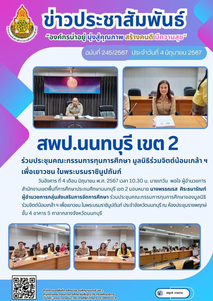 วันอังคาร ที่ 4 เดือน มิถุนายน พ.ศ. 2567 เวลา 10.30 น. นายเทวัน พอใจ ผู้อำนวยการสำนักงานเขตพื้นที่การศึกษาประถมศึกษานนทบุรี เขต 2 มอบหมาย นางพรรณรส ศิระธนารัณฑ์ ผู้อำนวยการกลุ่มส่งเสริมการจัดการศึกษา ร่วมประชุมคณะกรรมการทุนการศึกษาของมูลนิธิร่วมจิตต์น้อมเกล้า ฯ เพื่อเยาวชน ในพระบรมราชินูปถัมภ์ ประจำจังหวัดนนทบุรี ณ ห้องประชุมราชพฤกษ์ ชั้น 4 อาคาร 5 ศาลากลางจังหวัดนนทบุรี