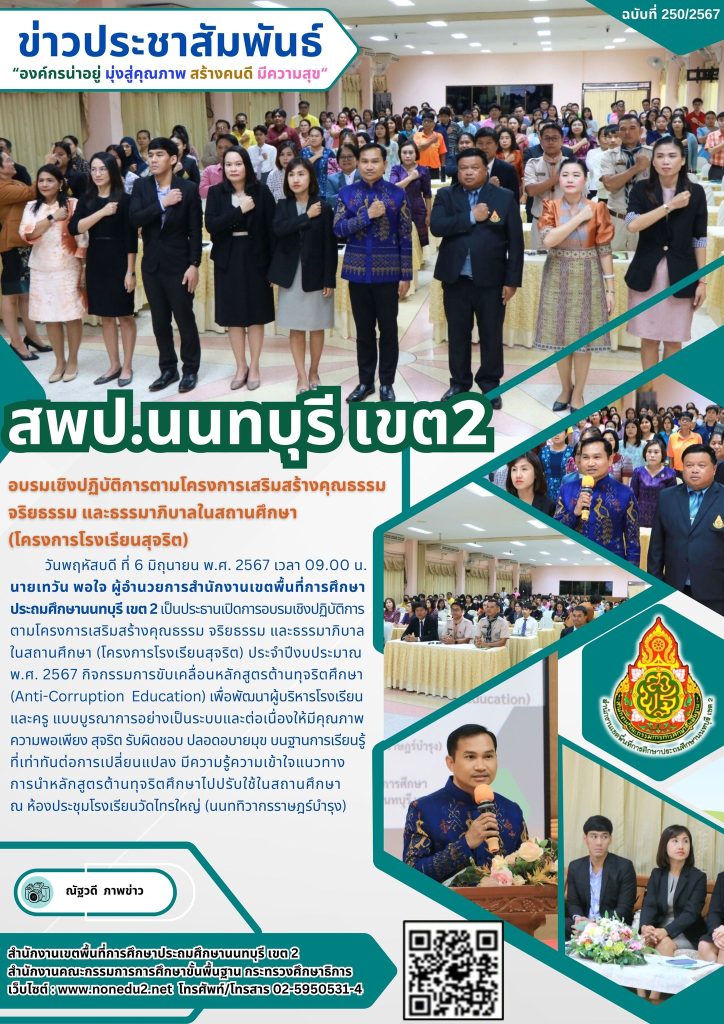 วันพฤหัสบดี ที่ 6 มิถุนายน พ.ศ. 2567 เวลา 09.00 น. นายเทวัน พอใจ ผู้อำนวยการสำนักงานเขตพื้นที่การศึกษาประถมศึกษานนทบุรี เขต 2 เป็นประธานเปิดการอบรมเชิงปฏิบัติการตามโครงการเสริมสร้างคุณธรรม จริยธรรม และธรรมาภิบาลในสถานศึกษา (โครงการโรงเรียนสุจริต) ประจำปีงบประมาณ พ.ศ. 2567 กิจกรรมการขับเคลื่อนหลักสูตรต้านทุจริตศึกษา (Anti-Corruption Education) เพื่อพัฒนาผู้บริหารโรงเรียนและครู แบบบูรณาการอย่างเป็นระบบและต่อเนื่องให้มีคุณภาพความพอเพียง สุจริต รับผิดชอบ ปลอดอบายมุข บนฐานการเรียนรู้ที่เท่าทันต่อการเปลี่ยนแปลง มีความรู้ความเข้าใจแนวทางการนำหลักสูตรต้านทุจริตศึกษาไปปรับใช้ในสถานศึกษา ณ ห้องประชุมโรงเรียนวัดไทรใหญ่ (นนททิวากรราษฎร์บำรุง)