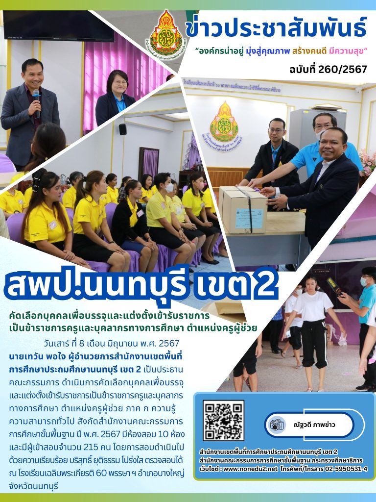 วันเสาร์ ที่ 8 เดือน มิถุนายน พ.ศ. 2567 นายเทวัน พอใจ ผู้อำนวยการสำนักงานเขตพื้นที่การศึกษาประถมศึกษานนทบุรี เขต 2 เป็นประธาน คณะกรรมการ ดำเนินการคัดเลือกบุคคลเพื่อบรรจุและแต่งตั้งเข้ารับราชการเป็นข้าราชการครูและบุคลากรทางการศึกษา ตำแหน่งครูผู้ช่วย ภาค ก ความรู้ ความสามารถทั่วไป สังกัดสำนักงานคณะกรรมการการศึกษาขั้นพื้นฐาน ปี พ.ศ. 2567 มีห้องสอบ 10 ห้อง และมีผู้เข้าสอบจำนวน 215 คน โดยการสอบดำเนินไปด้วยความเรียบร้อย บริสุทธิ์ ยุติธรรม โปร่งใส ตรวจสอบได้ ณ โรงเรียนเฉลิมพระเกียรติ 60 พรรษา ฯ อำเภอบางใหญ่ จังหวัดนนทบุรี