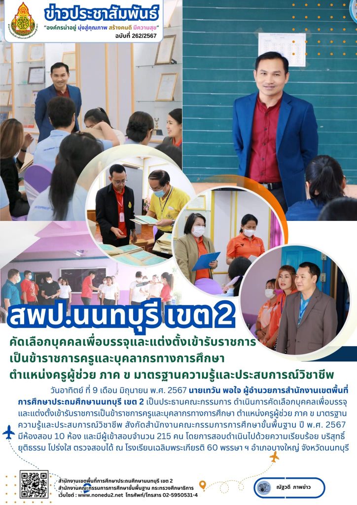 วันอาทิตย์ ที่ 9 เดือน มิถุนายน พ.ศ. 2567 นายเทวัน พอใจ ผู้อำนวยการสำนักงานเขตพื้นที่การศึกษาประถมศึกษานนทบุรี เขต 2 เป็นประธานคณะกรรมการ ดำเนินการคัดเลือกบุคคลเพื่อบรรจุและแต่งตั้งเข้ารับราชการเป็นข้าราชการครูและบุคลากรทางการศึกษา ตำแหน่งครูผู้ช่วย ภาค ข มาตรฐานความรู้และประสบการณ์วิชาชีพ สังกัดสำนักงานคณะกรรมการการศึกษาขั้นพื้นฐาน ปี พ.ศ. 2567 มีห้องสอบ 10 ห้อง และมีผู้เข้าสอบจำนวน 215 คน โดยการสอบดำเนินไปด้วยความเรียบร้อย บริสุทธิ์ ยุติธรรม โปร่งใส ตรวจสอบได้ ณ โรงเรียนเฉลิมพระเกียรติ 60 พรรษา ฯ อำเภอบางใหญ่ จังหวัดนนทบุรี