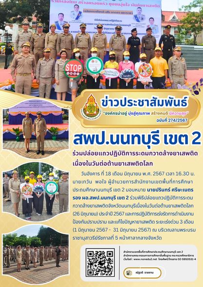 วันอังคาร ที่ 18 เดือน มิถุนายน พ.ศ. 2567 เวลา 16.30 น. นายเทวัน พอใจ ผู้อำนวยการสำนักงานเขตพื้นที่การศึกษาประถมศึกษานนทบุรี เขต 2 มอบหมาย นายปรินทร์ ศรีษะเนตร รอง ผอ.สพป.นนทบุรี เขต 2 ร่วมพิธีปล่อยแถวปฏิบัติการระดมกวาดล้างยาเสพติดจังหวัดนนทบุรีเนื่องในวันต่อต้านยาเสพติดโลก (26 มิถุนายน) ประจำปี 2567 และการปฏิบัติการเร่งรัดการดำเนินงานป้องกันปราบปราม และแก้ไขปัญหายาเสพติด ระยะเร่งด่วน 3 เดือน (1 มิถุนายน 2567 – 31 มิถุนายน 2567) ณ บริเวณลานพระบรมราชานุสาวรีย์รัชกาลที่ 5 หน้าศาลากลางจังหวัด