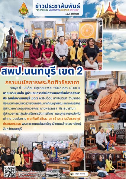 วันพุธ ที่ 19 เดือน มิถุนายน พ.ศ. 2567 เวลา 13.00 น. นายเทวัน พอใจ ผู้อำนวยการสำนักงานเขตพื้นที่การศึกษาประถมศึกษานนทบุรี เขต 2 พร้อมด้วย นางจินตนา จำปาทอง ผู้อำนวยการหน่วยตรวจสอบภายใน, นางภิญญาพัชญ์ สมานพันธ์สกุล ผู้อำนวยการกลุ่มอำนวยการ, นางพรรณรส ศิระธนารัณฑ์ ผู้อำนวยการกลุ่มส่งเสริมการจัดการศึกษา และบุคลากรในสังกัด เข้ากราบนมัสการ พระกิตติวชิรธาดา เจ้าอาวาสวัดราษฎร์ประคองธรรม พระราชาคณะชั้นสามัญ เจ้าคณะอำเภอบางใหญ่ จังหวัดนนทบุรี