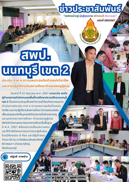 วันเสาร์ ที่ 22 มิถุนายน พ.ศ. 2567 นายเทวัน พอใจ ผู้อำนวยการสำนักงานเขตพื้นที่การศึกษาประถมศึกษานนทบุรี เขต 2 เป็นประธานประชุมชี้แจงทำความเข้าใจแก่คณะกรรมการดำเนินการประเมิน ภาค ค ความเหมาะสมกับตำแหน่งวิชาชีพ และการปฏิบัติงานในสถานศึกษา ในการสอบแข่งขันเพื่อบรรจุและแต่งตั้งบุคคลเข้ารับราชการเป็นข้าราชการครูและบุคลากรทางการศึกษา ตำแหน่งครูผู้ช่วย สังกัดสำนักงานคณะกรรมการการศึกษาขั้นพื้นฐาน ปี พ.ศ. 2567 พร้อมตรวจเยี่ยมสนามสอบและให้กำลังใจคณะกรรมการและผู้เข้าสอบ โดยมีห้องสอบ 6 ห้อง และมีผู้เข้าสอบ จำนวน 63 คน ณ โรงเรียนเฉลิมพระเกียรติ 60 พรรษา ฯ อำเภอบางใหญ่ จังหวัดนนทบุรี