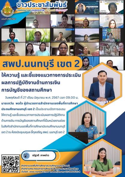 วันพฤหัสบดี ที่ 27 เดือน มิถุนายน พ.ศ. 2567 เวลา 09.00 น. นายเทวัน พอใจ ผู้อำนวยการสำนักงานเขตพื้นที่การศึกษาประถมศึกษานนทบุรี เขต 2 เป็นประธานเปิดการอบรมให้ความรู้ และชี้แจงแนวทางการประเมินผลการปฏิบัติงานด้านการเงิน การบัญชีของสถานศึกษาที่เป็นหน่วยงานย่อยในสังกัดสำนักงานเขตพื้นที่การศึกษาประถมศึกษานนทบุรี เขต 2 ณ ห้องประชุมนฤมล ลี้กุลเจริญ สพป. นนทบุรี เขต 2