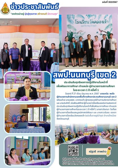 วันศุกร์ ที่ 27 เดือน มิถุนายน พ.ศ. 2567 นายเทวัน พอใจ ผู้อำนวยการสำนักงานเขตพื้นที่การศึกษาประถมศึกษานนทบุรี เขต 2 พร้อมด้วย นายนพพร มากคงแก้ว ผู้ทรงคุณวุฒิด้านการบริหารการศึกษา และ นายประสิทธิ์ เด่นพัฒนพิทักษ์ ผู้อำนวยการโรงเรียนชลประทานสงเคราะห์ ประเมินสัมฤทธิผลการปฎิบัติงานในหน้าที่เพื่อพัฒนาการศึกษา ตำแหน่งผู้อำนวยการสถานศึกษาในระยะเวลา 1 ปี ครั้งที่ 1 นางสาวจินตนา ใจเที่ยง ผู้อำนวยการโรงเรียนสมบูรณ์ศาสตร์พัฒนา และ นางสาววรันธร ยองจา ผู้อำนวยการโรงเรียนวัดคลองเจ้า (แช่มชื่นราษฎร์บำรุง) อำเภอไทรน้อย จังหวัดนนทบุรี