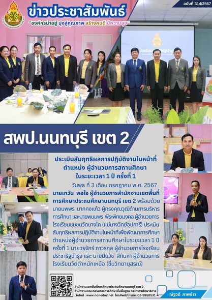 วันพุธ ที่ 3 เดือน กรกฎาคม พ.ศ. 2567 นายเทวัน พอใจ ผู้อำนวยการสำนักงานเขตพื้นที่การศึกษาประถมศึกษานนทบุรี เขต 2 พร้อมด้วย นายนพพร มากคงแก้ว ผู้ทรงคุณวุฒิด้านการบริหารการศึกษา และนายพนมพร พีระพิทยมงคล ผู้อำนวยการโรงเรียนชุมชนวัดบางโค (แม่นางวิทย์อุปการี) ประเมินสัมฤทธิผลการปฎิบัติงานในหน้าที่เพื่อพัฒนาการศึกษา ตำแหน่งผู้อำนวยการสถานศึกษาในระยะเวลา 1 ปี ครั้งที่ 1 นายวรจักร์ ถาวรกุล ผู้อำนวยการโรงเรียนประชารัฐบำรุง และ นายปิยวัช สีกันหา ผู้อำนวยการโรงเรียนวัดตำหนักเหนือ (ชื่นวิทยานุสรณ์)