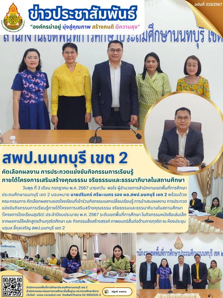 วันพุธ ที่ 3 เดือน กรกฎาคม พ.ศ. 2567 นายเทวัน พอใจ ผู้อำนวยการสำนักงานเขตพื้นที่การศึกษาประถมศึกษานนทบุรี เขต 2 มอบหมาย นายปรินทร์ ศรีษะเนตร รอง ผอ.สพป.นนทบุรี เขต 2 พร้อมด้วย คณะกรรมการ คัดเลือกผลงานของโรงเรียนที่เข้าร่วมกิจกรรมแลกเปลี่ยนเรียนรู้ การนำเสนอผลงาน การประกวดแข่งขันกิจกรรมการเรียนรู้ภายใต้โครงการเสริมสร้างคุณธรรม จริยธรรมและธรรมาภิบาลในสถานศึกษา (โครงการโรงเรียนสุจริต) ประจำปีงบประมาณ พ.ศ. 2567 ระดับเขตพื้นที่การศึกษา ในกิจกรรมหนังสือเล่มเล็กจากผลการใช้หลักสูตรต้านทุจริตศึกษา และ กิจกรรมสื่อสร้างสรรค์ ภาพยนตร์สั้นต่อต้านการทุจริต ณ ห้องประชุมนฤมล ลี้กุลเจริญ สพป.นนทบุรี เขต 2