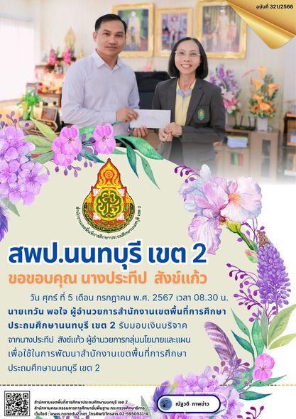 วันศุกร์ ที่ 5 เดือน กรกฎาคม พ.ศ. 2567 เวลา 08.30 น. นายเทวัน พอใจ ผู้อำนวยการสำนักงานเขตพื้นที่การศึกษาประถมศึกษานนทบุรี เขต 2 รับมอบเงินบริจาค จากนางประทีป สังข์แก้ว ผู้อำนวยการกลุ่มนโยบายและแผน เพื่อใช้ในการพัฒนาสำนักงานเขตพื้นที่การศึกษาประถมศึกษานนทบุรี เขต 2