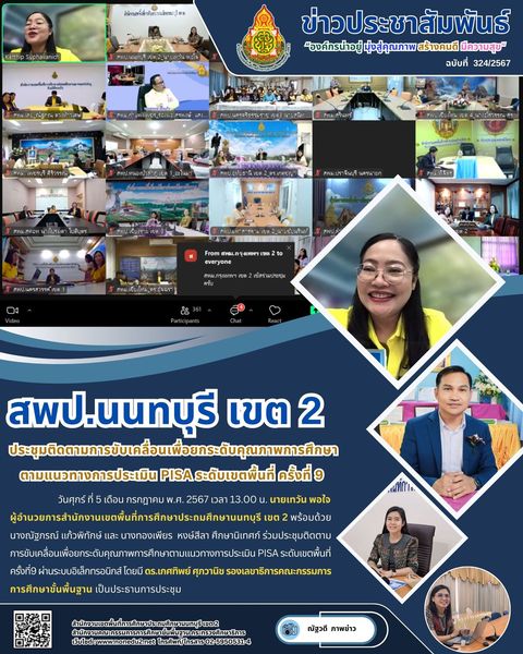 วันศุกร์ ที่ 5 เดือน กรกฎาคม พ.ศ. 2567 เวลา 13.00 น. นายเทวัน พอใจ ผู้อำนวยการสำนักงานเขตพื้นที่การศึกษาประถมศึกษานนทบุรี เขต 2 พร้อมด้วย นางณัฐภรณ์ แก้วพิทักษ์ และ นางทองเพียร หงษ์สีลา ศึกษานิเทศก์ ร่วมประชุมติดตามการขับเคลื่อนเพื่อยกระดับคุณภาพการศึกษาตามแนวทางการประเมิน PISA ระดับเขตพื้นที่ ครั้งที่9 ผ่านระบบอิเล็กทรอนิกส์ โดยมี ดร.เกศทิพย์ ศุภวานิช รองเลขาธิการคณะกรรมการการศึกษาขั้นพื้นฐาน เป็นประธานการประชุม