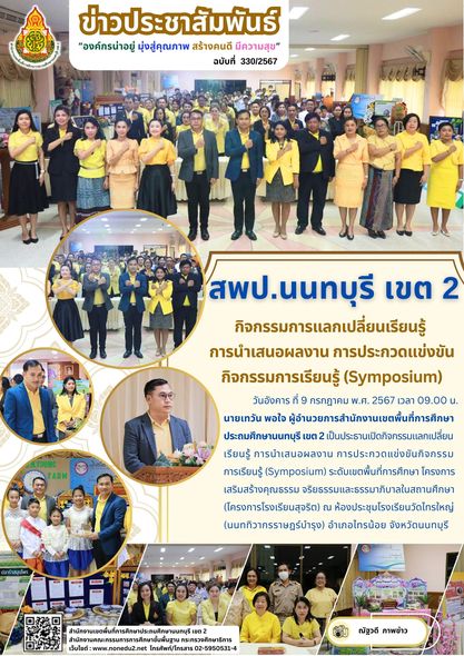 วันอังคาร ที่ 9 กรกฎาคม พ.ศ. 2567 เวลา 09.00 น. นายเทวัน พอใจ ผู้อำนวยการสำนักงานเขตพื้นที่การศึกษาประถมศึกษานนทบุรี เขต 2 เป็นประธานเปิดกิจกรรมแลกเปลี่ยนเรียนรู้ การนำเสนอผลงาน การประกวดแข่งขันกิจกรรมการเรียนรู้ (Symposium) ระดับเขตพื้นที่การศึกษา โครงการเสริมสร้างคุณธรรม จริยธรรมและธรรมาภิบาลในสถานศึกษา (โครงการโรงเรียนสุจริต) ณ ห้องประชุมโรงเรียนวัดไทรใหญ่ (นนททิวากรราษฎร์บำรุง) อำเภอไทรน้อย จังหวัดนนทบุรี