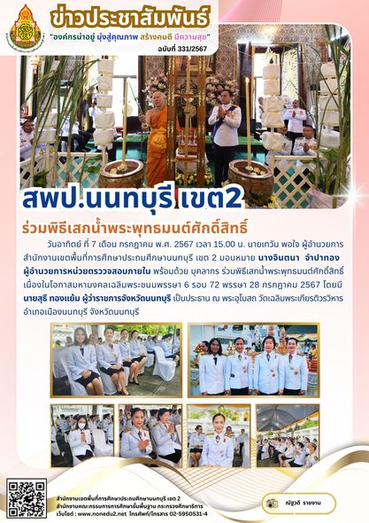 วันอาทิตย์ ที่ 7 เดือน กรกฎาคม พ.ศ. 2567 เวลา 15.00 น. นายเทวัน พอใจ ผู้อำนวยการสำนักงานเขตพื้นที่การศึกษาประถมศึกษานนทบุรี เขต 2 มอบหมาย นางจินตนา จำปาทอง ผู้อำนวยการหน่วยตรววจสอบภายใน พร้อมด้วย บุคลากร ร่วมพิธีเสกน้ำพระพุทธมนต์ศักดิ์สิทธิ์เนื่องในโอกาสมหามงคลเฉลิมพระชนมพรรษา 6 รอบ 72 พรรษา 28 กรกฎาคม 2567 โดยมี นายสุธี ทองแย้ม ผู้ว่าราชการจังหวัดนนทบุรี เป็นประธาน ณ พระอุโบสถ วัดเฉลิมพระเกียรติวรวิหาร อำเภอเมืองนนทบุรี จังหวัดนนทบุรี